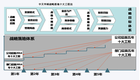 中天华溥针对这一问题,在战略咨询实践的过程中,开创性的提出“战略落地十大工程法”模型。战略落地十大工程法的基本思路是将公司五年年度战略目标分解成十件重大的事件,只要完成这十大事件,就能够保证战略的最终实现。总经理每天就关注这十件事的进度,将十件事交给不同的副总去负责。在这十件事的基础上,为了完成每件事,需要把每件事分解成十件小事,作为完成这件大事的重大里程碑式节点。分管这件大事的副总只管关注这十件小事的进度完成即可,同时这十件小事可以分到每个部门的身上,成为部门战略绩效指标。